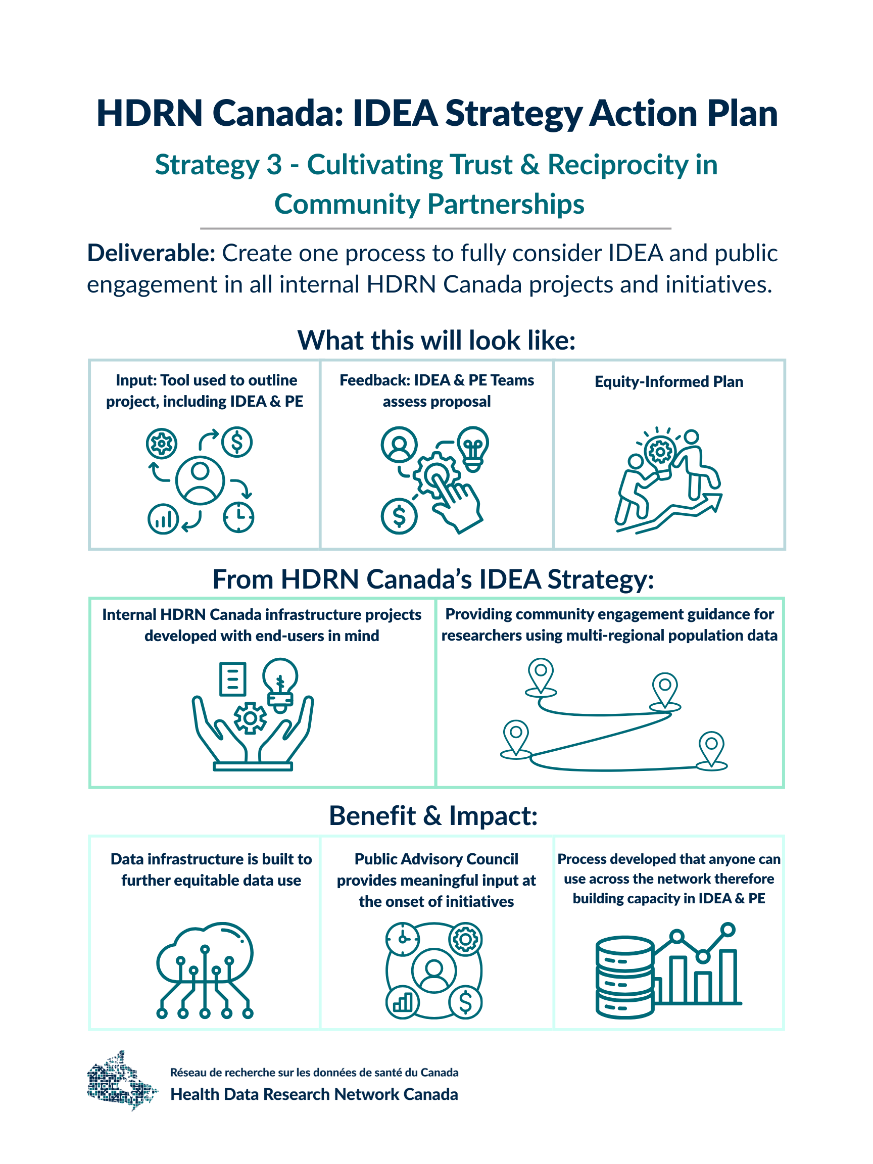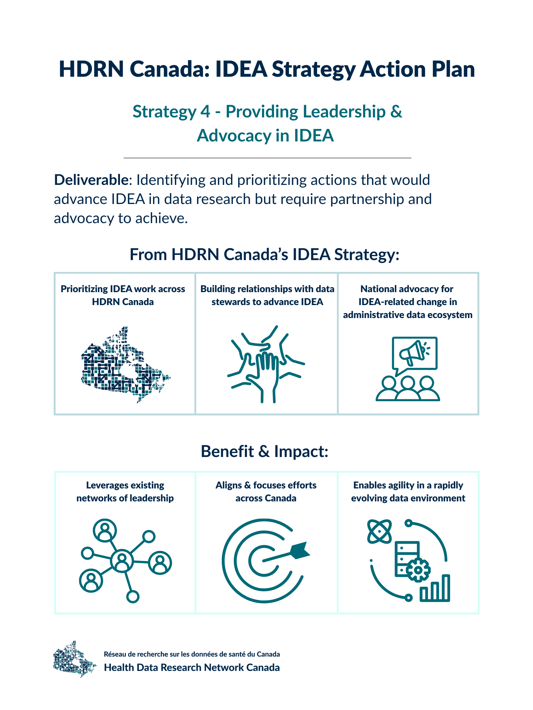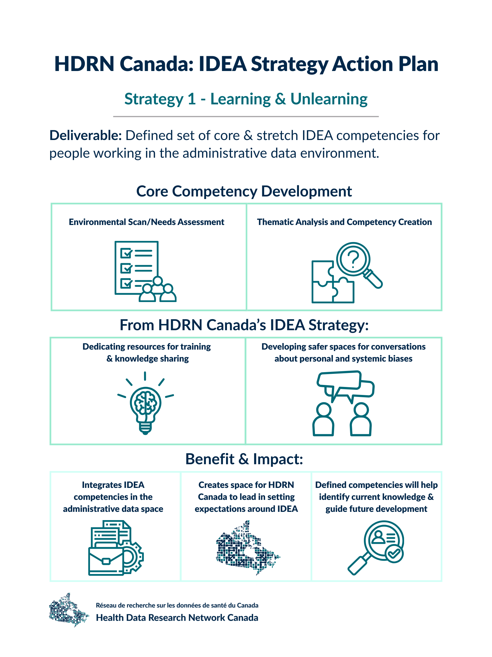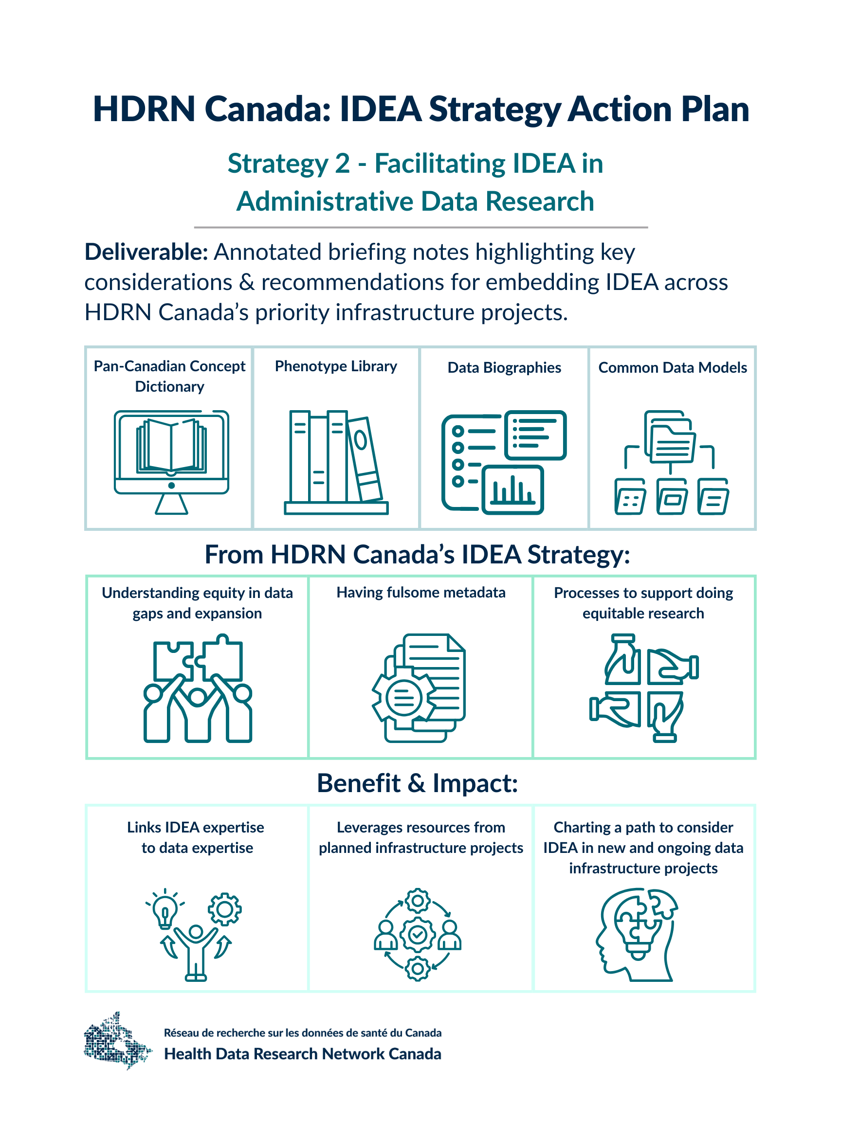 The HDRN Canada IDEA Strategy was developed collaboratively with input from all HDRN Canada Member Organizations and Teams. The strategy has three core goals: to identify practical, high-impact actions that embed inclusion, diversity, equity and accessibility (IDEA) across all HDRN Canada strategic goals and initiatives; to clearly define roles and responsibilities across the network; and to advance shared commitments to IDEA and Indigenous reconciliation. We developed the HDRN Canada IDEA Strategy Action Plan to implement specific initiatives across four strategic areas. This Strategy and Action Plan represent the first of many steps toward a data research ecosystem that is inclusive, diverse, equitable and accessible.